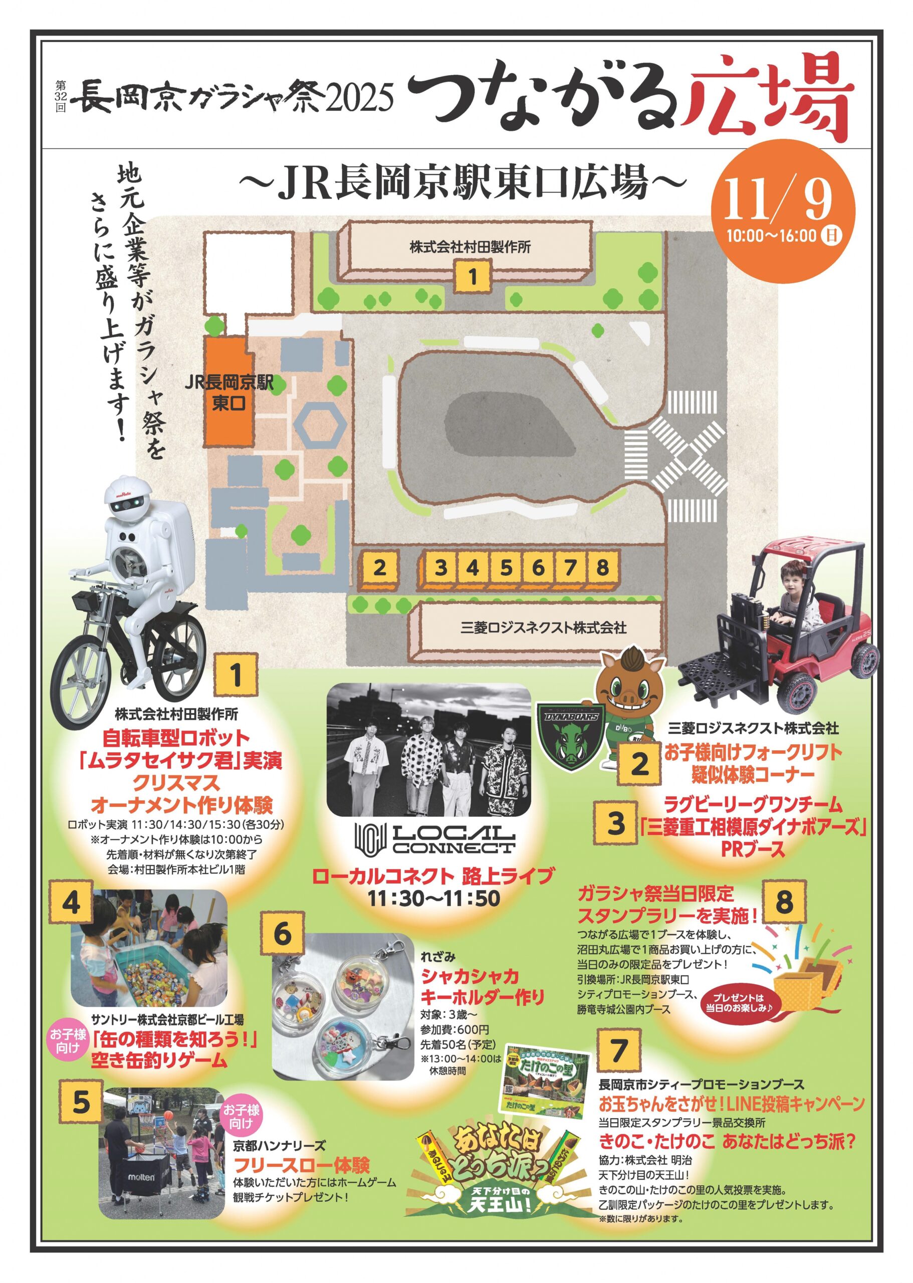 今年の楽市楽座は新たに、つながる広場(JR長岡京駅東口広場)で地元企業による体験型ブースの出店が開催されます!